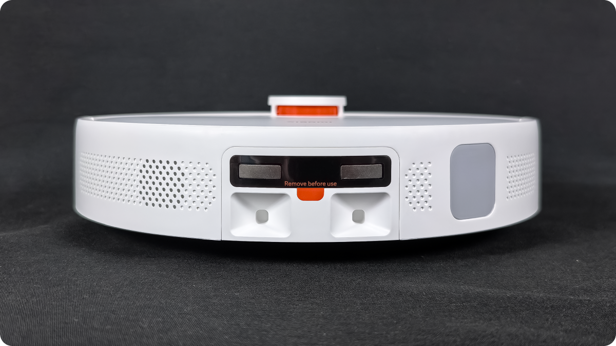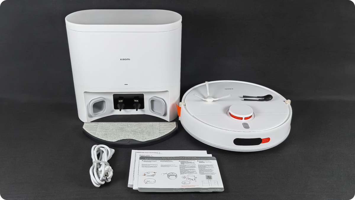 Чистый, аккуратный дизайн: белый матовый корпус с оранжевыми акцентами, хороший пластик и плотная сборка. В коробке — сам робот, док-станция с самоочисткой, кабель питания, боковая щётка, мешок-пылесборник, контейнеры для мусора и воды, салфетка. Для старта ничего докупать не нужно.