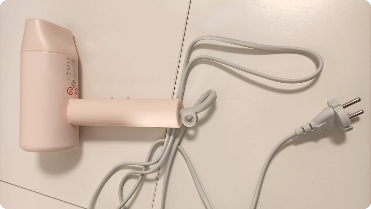 По ощущениям он лёгкий, почти невесомый — около 430 граммов, и это чувствуется. Даже при длинной сушке запястье не устаёт, а звук работы не раздражает: шум приглушённый, без писка и вибраций. Шнур достаточно длинный, чтобы спокойно сушить волосы у зеркала, не выискивая розетку рядом. Всё просто и удобно — как раз то, чего ждёшь от домашнего фена.