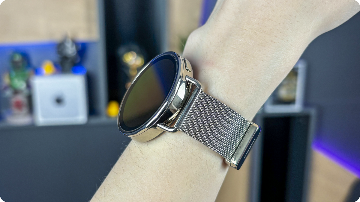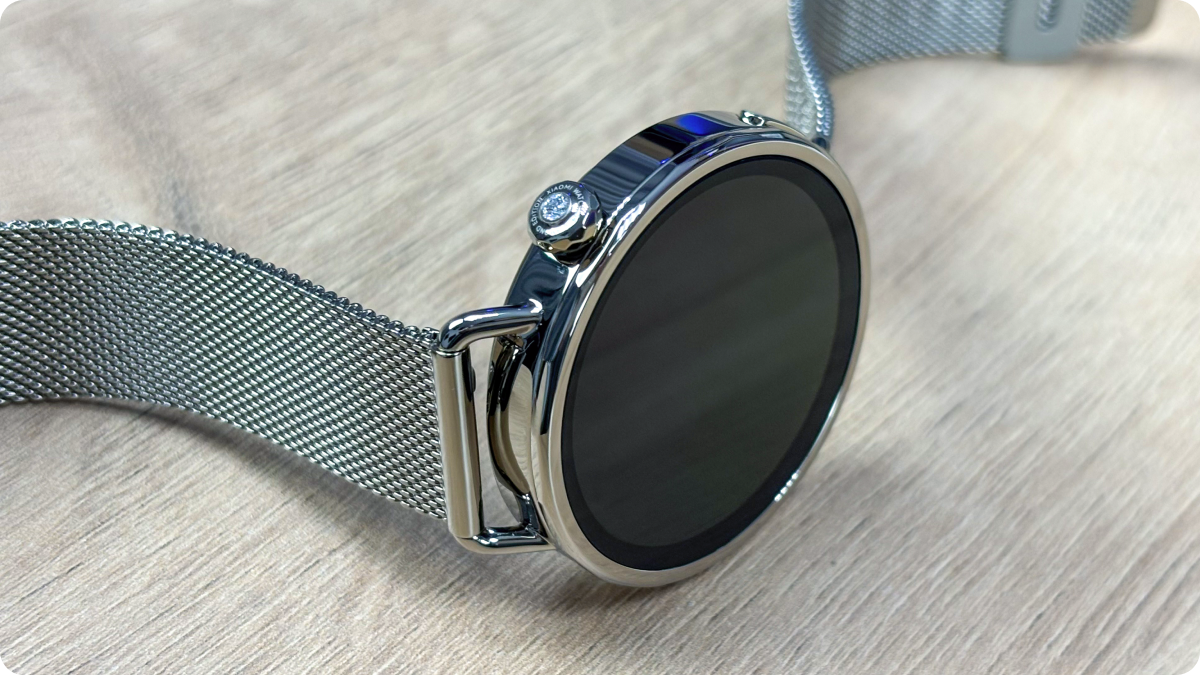 С первого взгляда понятно — Xiaomi Watch S4 41mm не выглядят «младшей» моделью. Корпус из нержавеющей стали, стекло с лёгким изгибом и компактные пропорции создают ощущение премиальности. На руке часы почти не ощущаются — всего 32 грамма без ремешка. Толщина корпуса — всего 9,5 мм, и это делает их одними из самых тонких в своём классе.