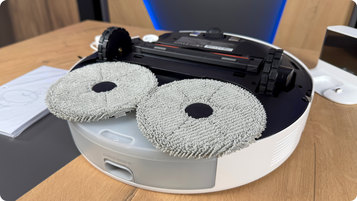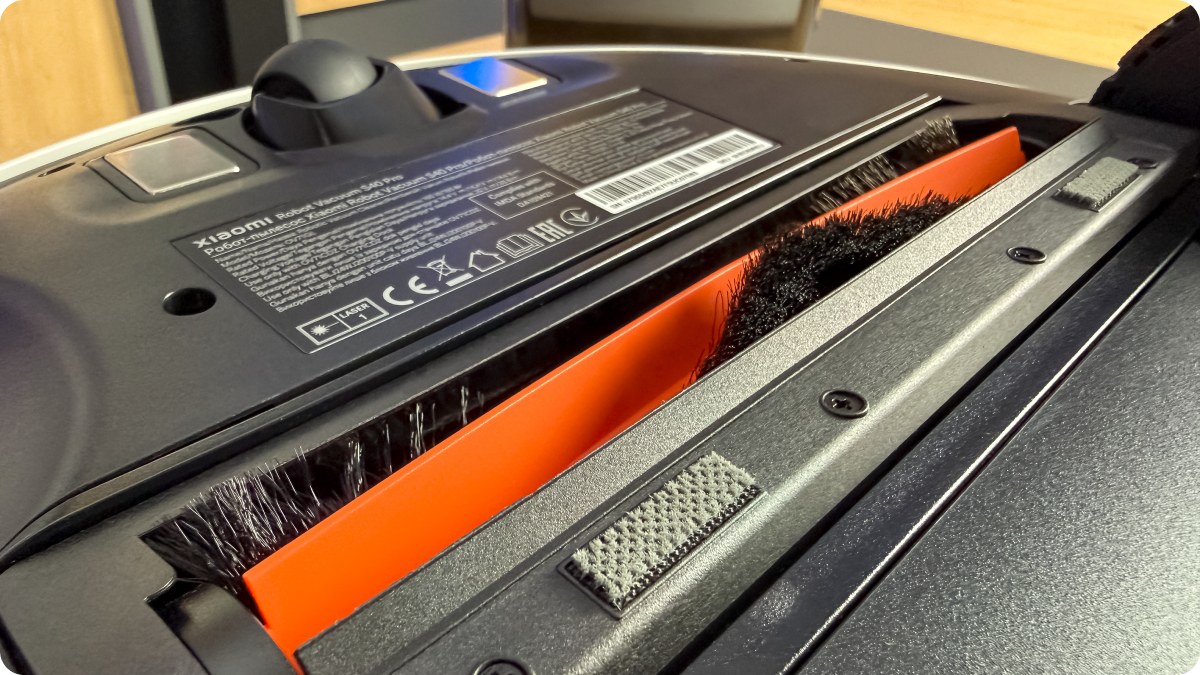 Снизу виден прогресс — выдвижная боковая щётка, новая резиновая турбощётка и блок мопа с возможностью подъёма на 10 мм. Это спасает ковры от намокания, и да, теперь можно запускать влажную уборку, не боясь испортить текстиль.