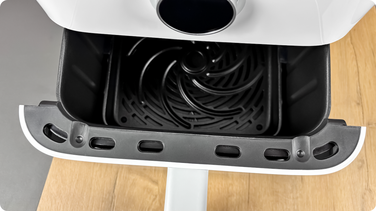 Внешне аэрогриль выполнен в минималистичном стиле, без лишнего глянца и визуального шума. Он одинаково уместен на классической и современной кухне. Вертикальный корпус экономит место на столешнице, а матовая поверхность не оставляет следов от пальцев. Управление интуитивное: сверху сенсорная панель с дисплеем, снизу — корзина, которая выдвигается мягко и без усилий.