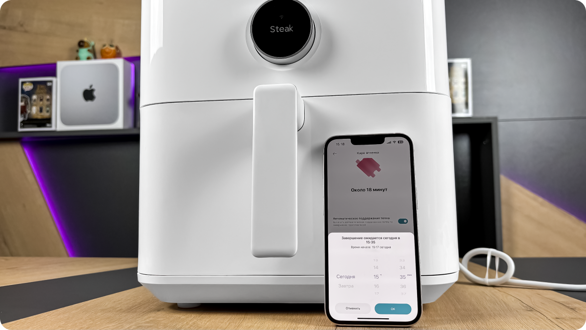 Управлять можно как вручную, так и со смартфона через Mi Home. В приложении выставляется температура, время и режим, а также можно следить за процессом и получать уведомление о готовности. Поддержка Google Assistant позволяет запускать аэрогриль голосом — удобно, когда руки заняты готовкой.