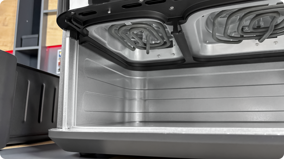 Главное достоинство Dual Zone — возможность готовить два блюда одновременно. Левая камера рассчитана на 3,5 литра, правая — на 6,5. В каждой можно установить свои параметры, что удобно, когда вы, например, запекаете курицу с одной стороны и делаете картофель фри с другой. После завершения цикла аэрогриль подаёт сигнал, а встроенные напоминания помогают вовремя перевернуть продукты. Благодаря раздельным потокам воздуха и разным температурным зонам оба блюда получаются равномерно прожаренными и готовы одновременно.