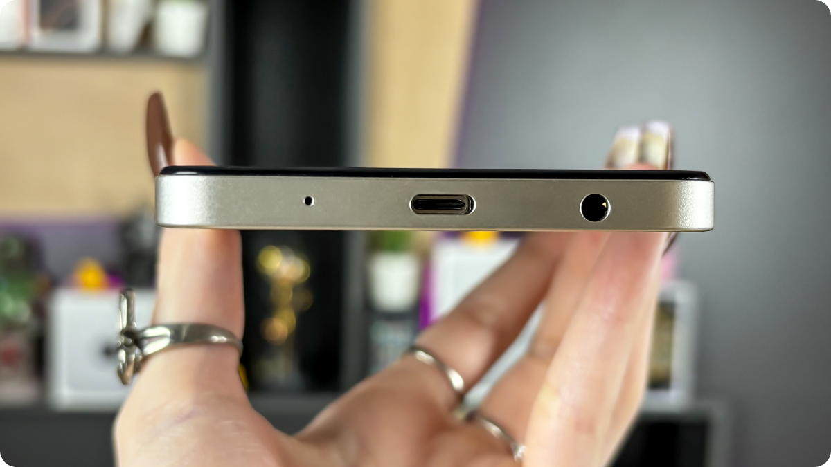 Снизу — порт USB-C, микрофон и разъём под наушники, сверху — динамик и дополнительное отверстие для шумоподавления. Лоток тройной: две SIM-карты и microSD одновременно, без компромиссов. Всё по делу — практично и удобно.