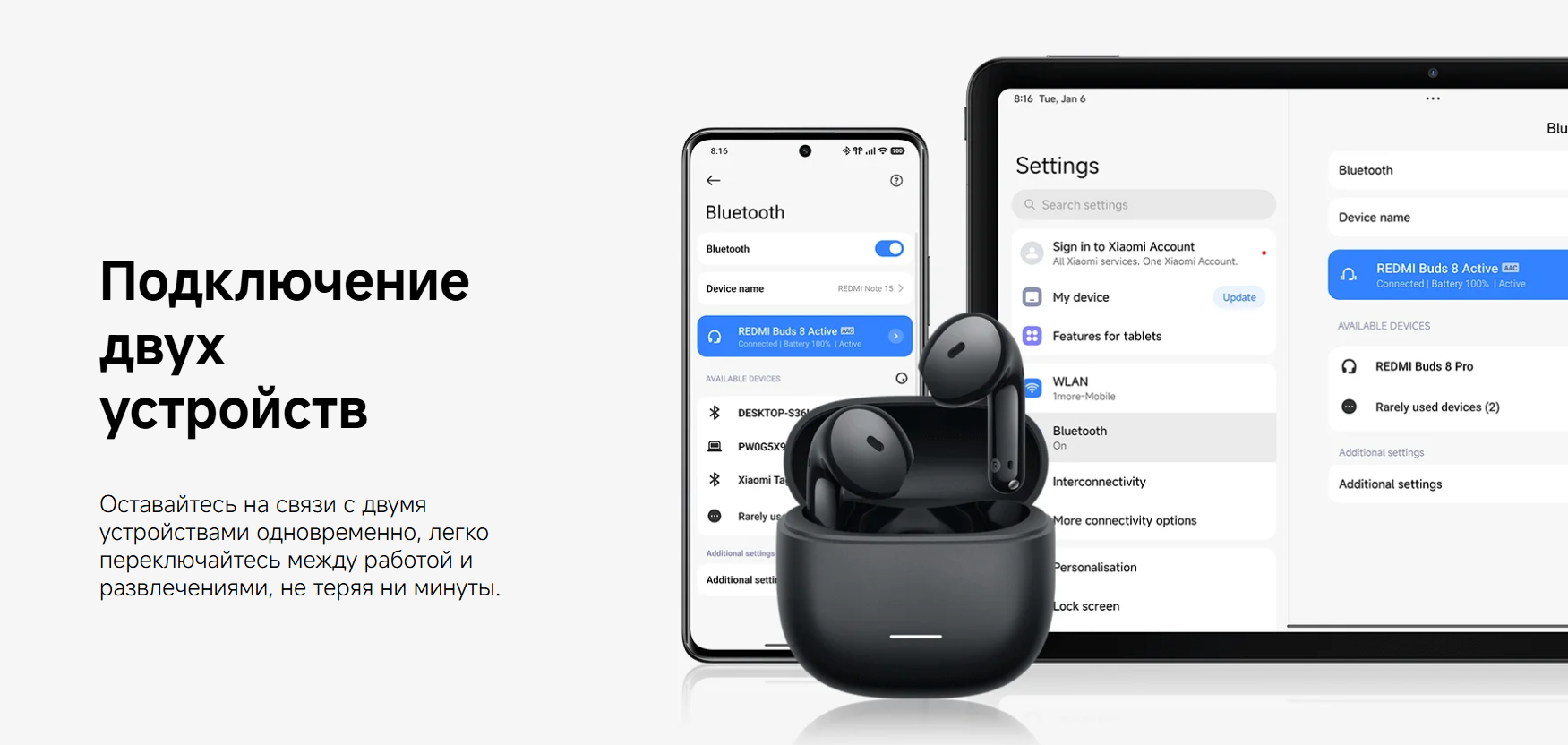 Buds 8 Active поддерживают активное шумоподавление, что делает прослушивание более комфортным в шумной обстановке. Для общения предусмотрена система из двух микрофонов с ИИ и шумоподавлением, которая помогает точнее передавать голос во время звонков, видеосвязи и голосовых сообщений.