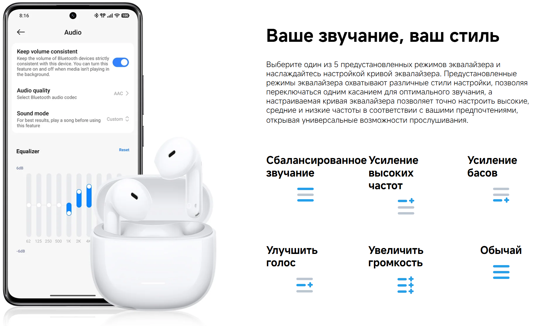 Модель поддерживает прозрачный режим, который позволяет лучше слышать окружающие звуки, не снимая наушники. Сенсорное управление делает использование более удобным, а через приложение Xiaomi Earbuds можно гибче настраивать работу наушников и управлять основными функциями со смартфона.