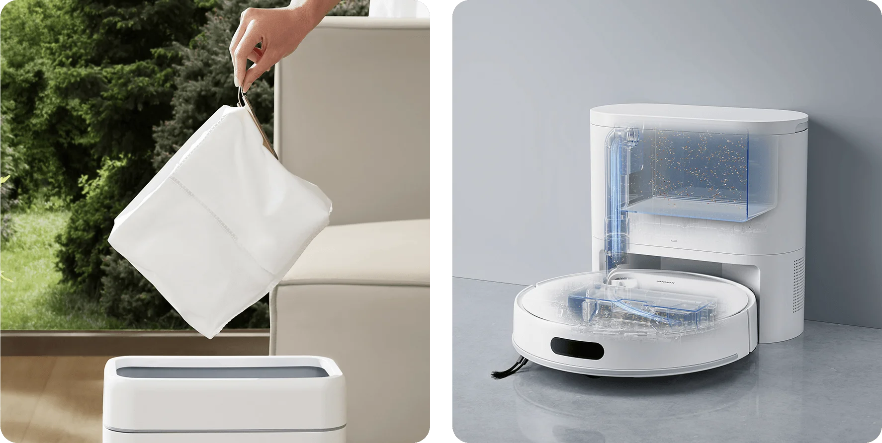 Пылесборник объёмом 0.35 л дополняется станцией с 4-литровым мешком, который нужно менять всего раз в 2–3 месяца. Одноразовый мешок делает процесс чистым и гигиеничным, что особенно важно для аллергиков.