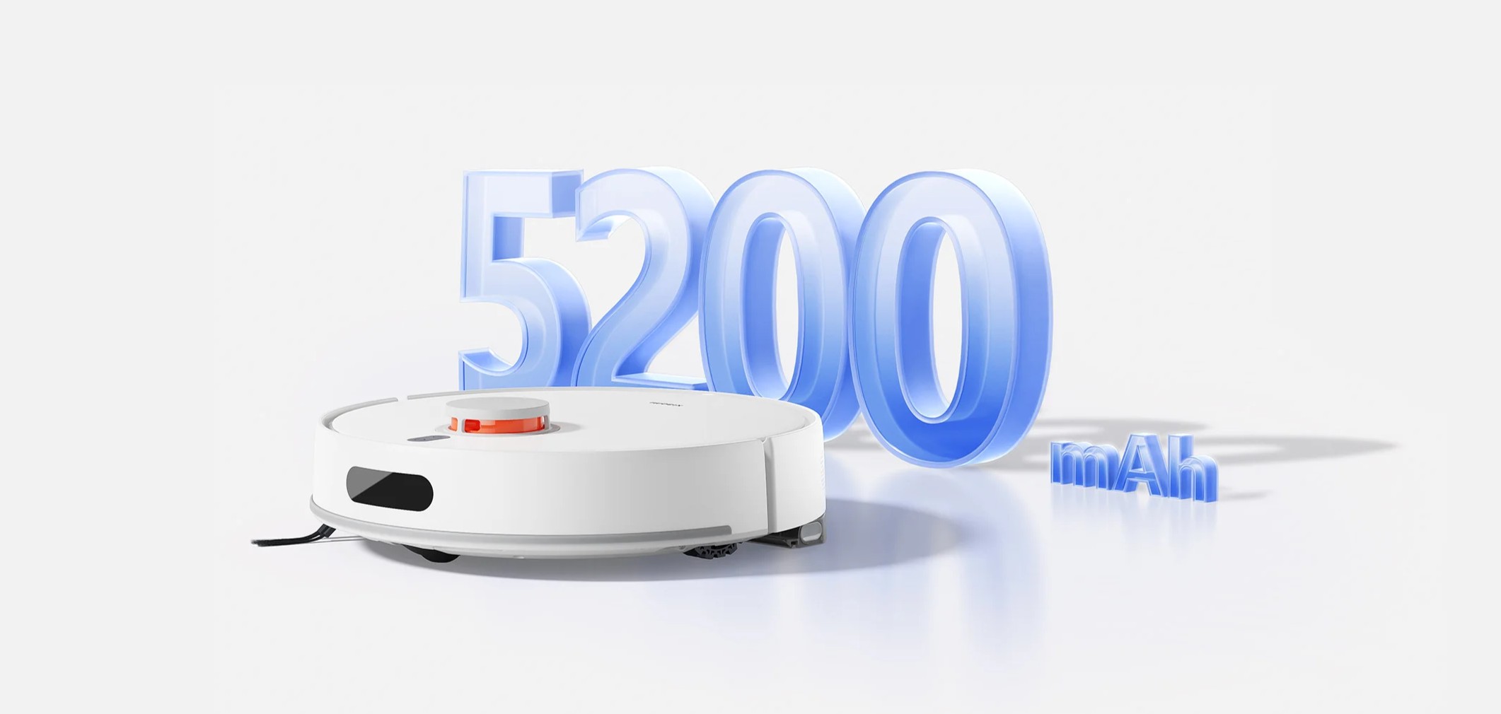 Аккумулятор ёмкостью 5200 мАч обеспечивает до трёх часов работы без подзарядки. Этого достаточно для уборки квартиры площадью более 120 м² за один цикл.