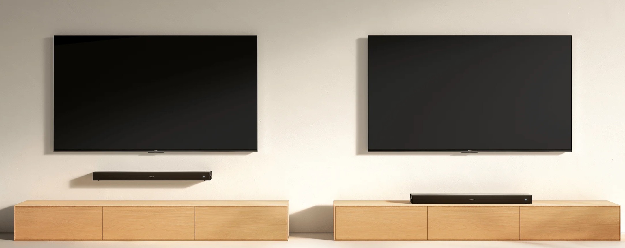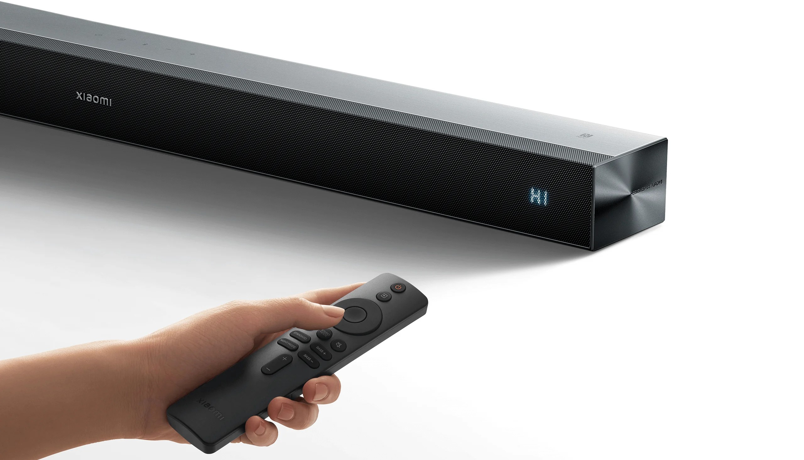 Xiaomi Soundbar Pro 2.0 создан в аккуратном минималистичном стиле, который легко вписывается под любой современный телевизор. Передняя металлическая сетка скрывает динамики и делает панель визуально цельной, а корпус с алюминиевым акцентом выглядит строго и аккуратно. Ширина в 84 см помогает саундбару гармонично смотреться под 43–55-дюймовыми телевизорами, при этом он остаётся достаточно лёгким, чтобы без проблем разместить его как на тумбе, так и на стене. Компактная высота не закрывает нижнюю часть экрана и не мешает просмотру.