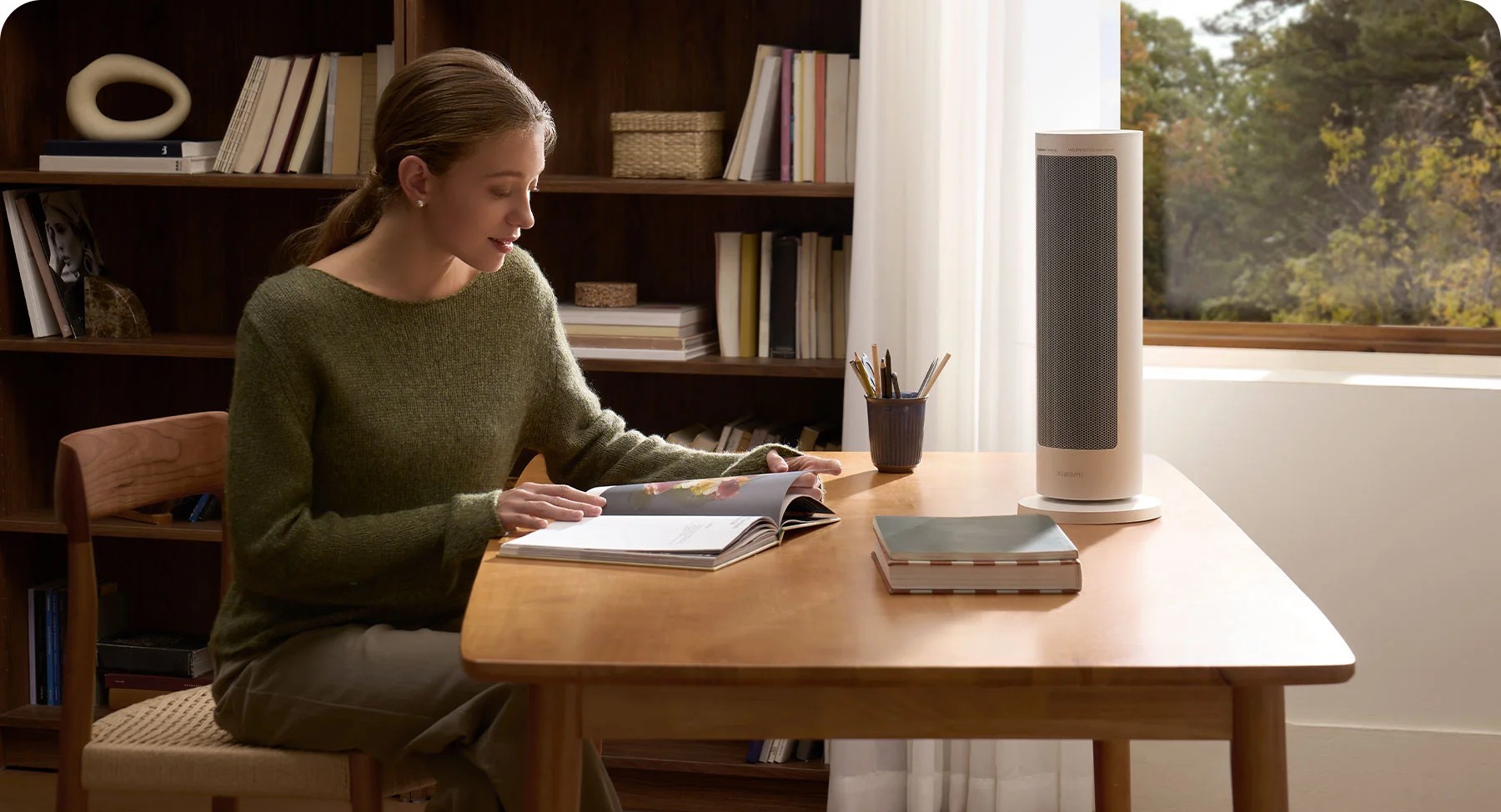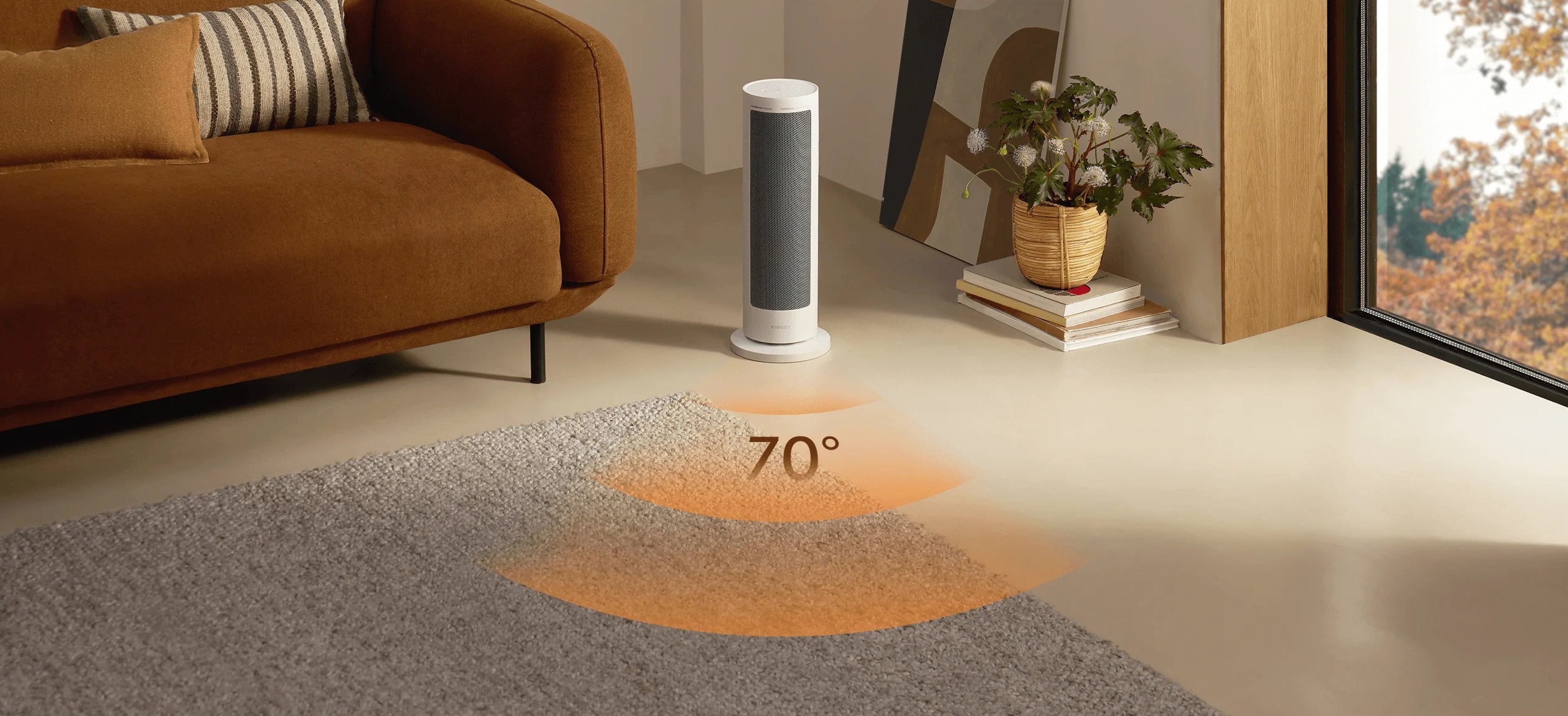 Устройство поддерживает три режима: горячий поток для холодной погоды, тёплый для межсезонья и естественный ветерок для лёгкой прохлады. Система автоматически регулирует уровень мощности, чтобы избежать перепадов тепла и снизить энергопотребление. Широкий угол поворота на 70° позволяет равномерно распределить воздух по комнате и создать ощущение объёмного обогрева.